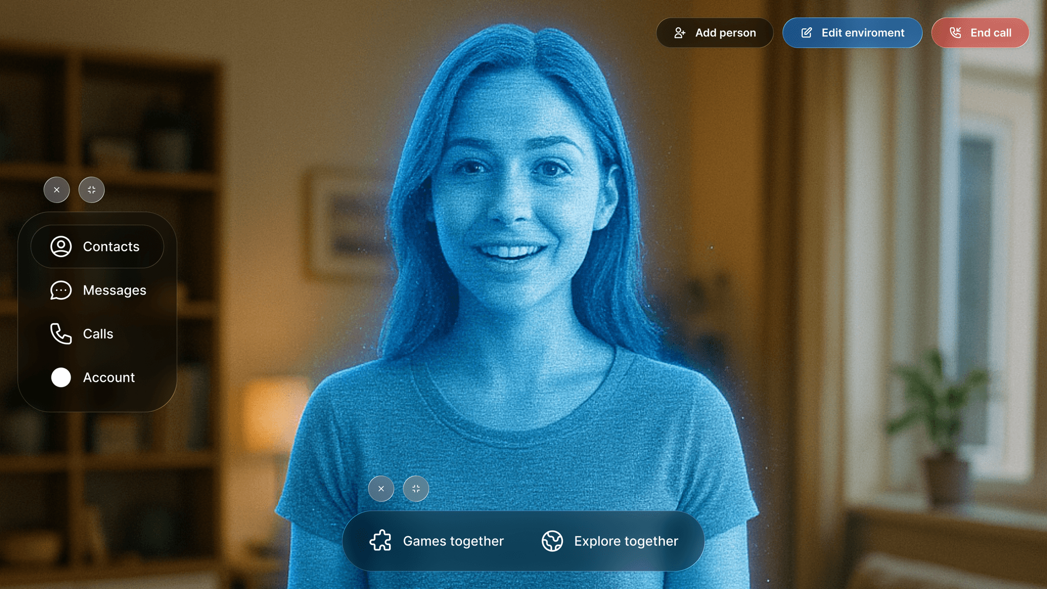 Futuristic AR communication platform concept—designed holographic calls and interactive environments for remote socializing and entertainment.